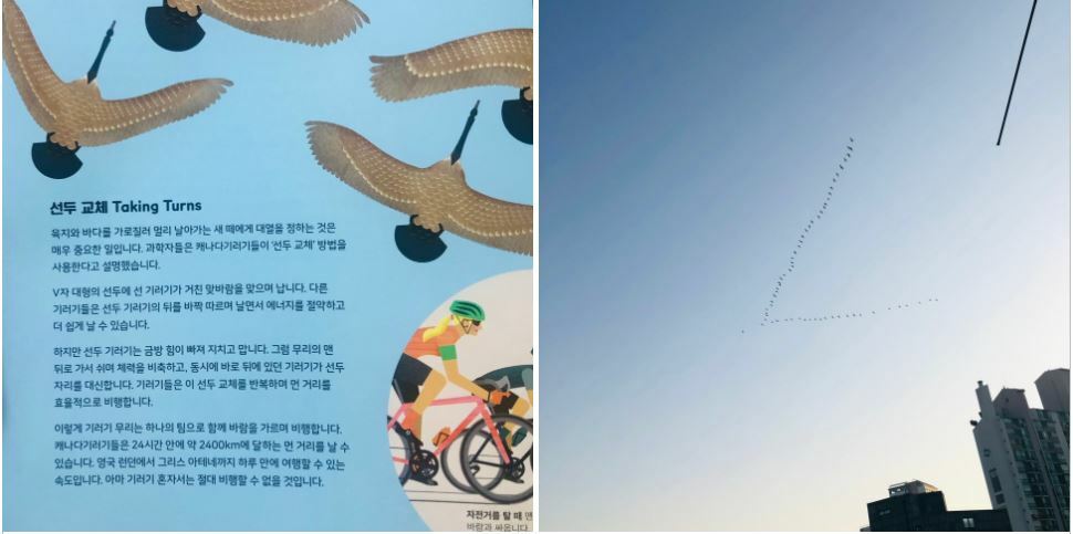 선두 기러기는 금방 힘이 빠져 지치기 때문에, 맨 뒤로 가서 체력을 비축하고, 또 다른 새와 선두 교체를 한다고 합니다.