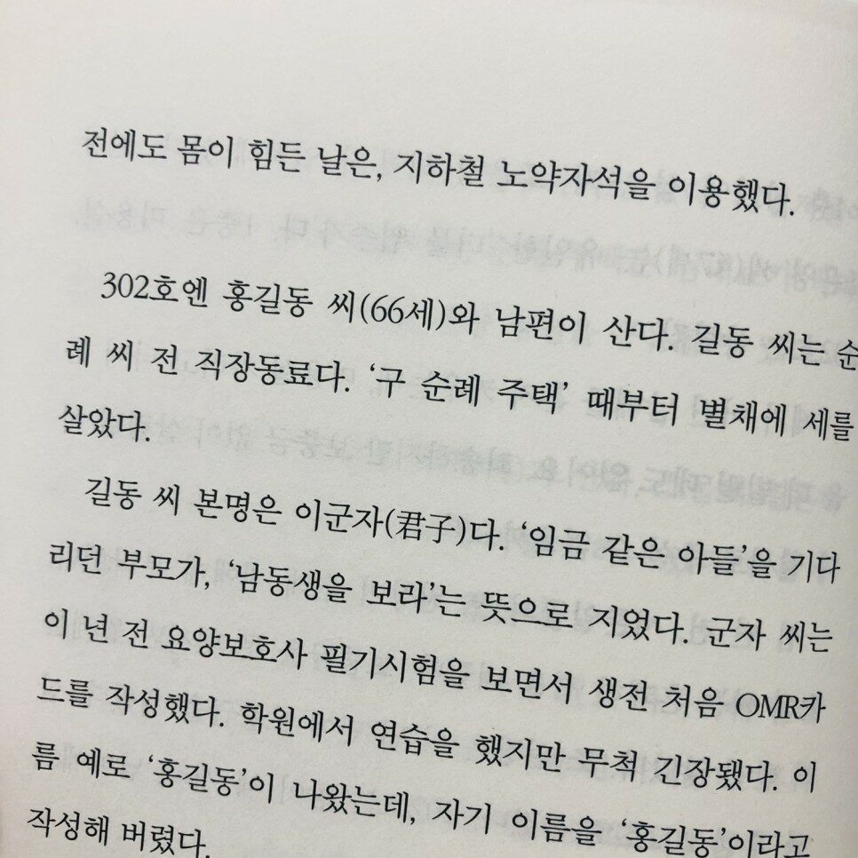302호에 홍길동씨 66세 순례씨의 전 직장 동료. 본명은 이군자. 남편과 같이 삽니다.