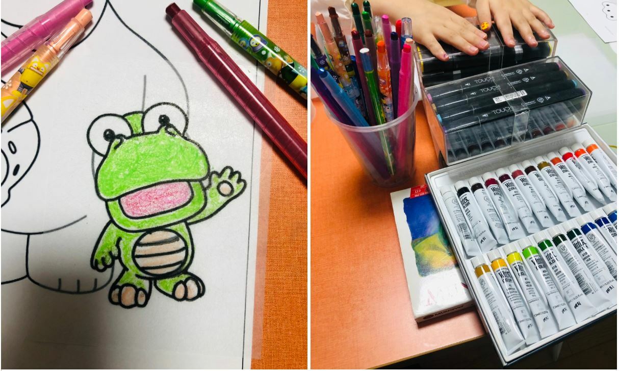 우리집에 어떤 채색 도구가 있나 살펴보고~ 채색 도구를 챙겼습니다.