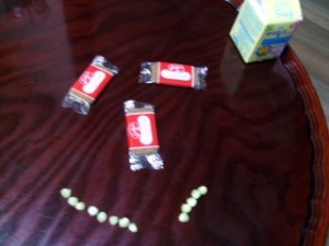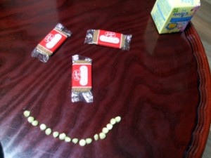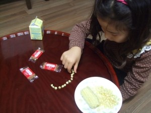 먹던 옥수수알로 입을 표현하고 엄마가 먹고있던 과자로 눈과 코를 표현하네요~