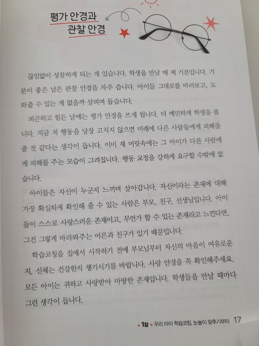 끊임없이 성찰하게 되는 게 있습니다. 학생을 만날 때 제 기분입니다. 기분이 좋은 날은 관찰 안경을 자주 씁니다. 아이들 그대로를 바라보고, 도와줄 수 있는 게 없을까 살피며 돕습니다.