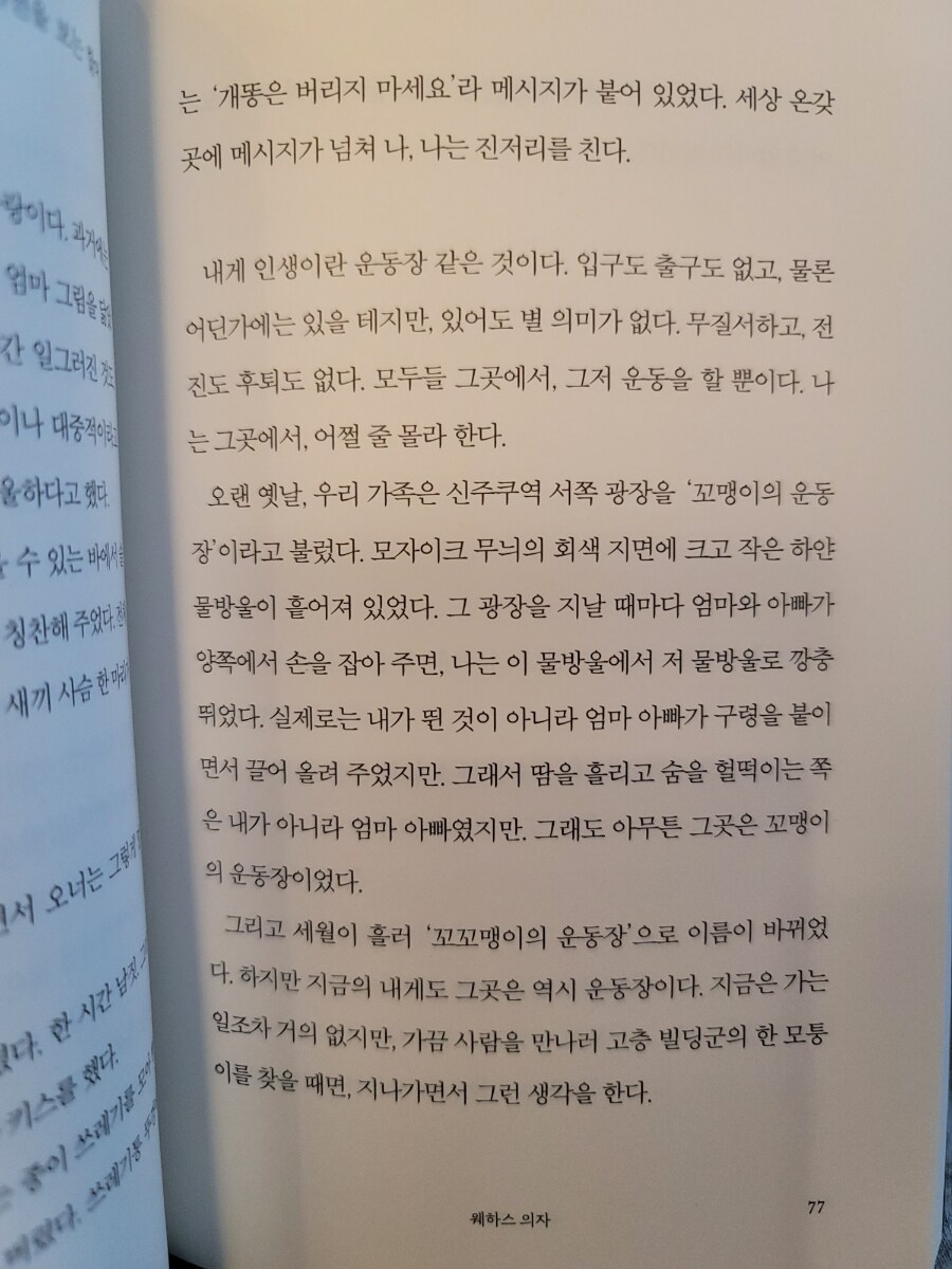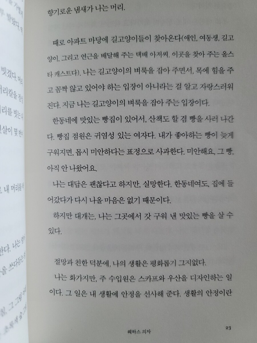 이렇게 단 시간에 확 빠져서 소설을 읽은 건 최근에 '바리' 읽은 이후로 웨하스 의자가 기억에 남겠구나.