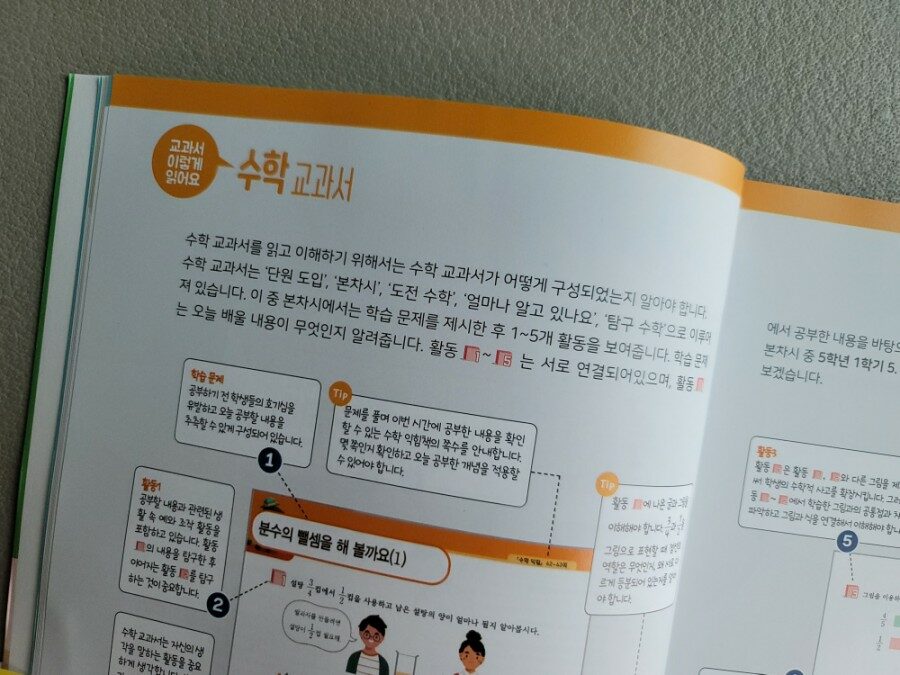 수학 교과서를 읽고 이해하기 위해서는 수학 교과서가 어떻게 구성되었는지 알아야 합니다. 수학 교과서는 '단원 도입', '본차시', '도전 수학', '얼마나 알고 있나요', '탐구 수학'으로 이루어져 있습니다. 이 중 본차시에서는 학습 문제를 제시한 후 1~5개 활동을 보여줍니다. 학습 문제는 오늘 배울 내용이 무엇인지 알려줍니다.