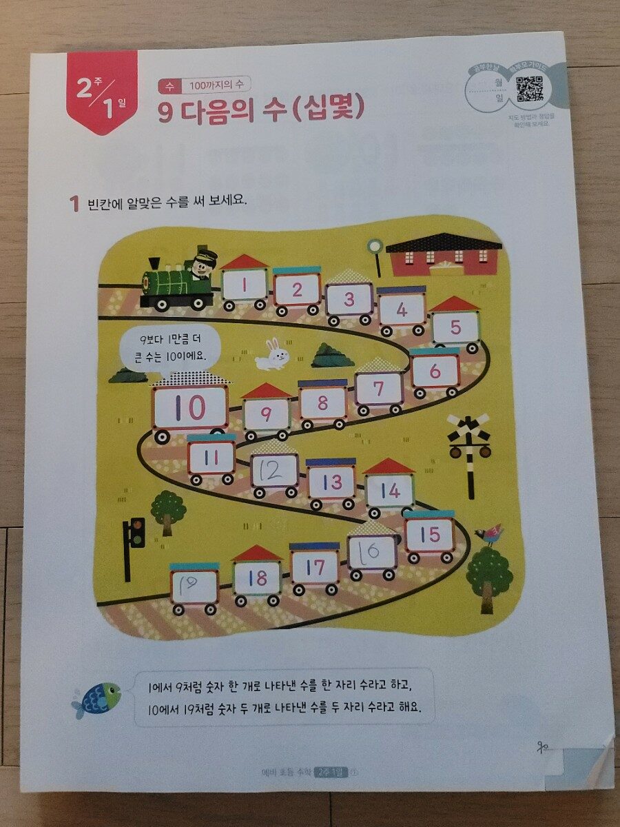 처음으로 두 자리 수를 배우는 단계여서 기차에 쓰여진 순서에 맞게 빈칸에 알맞은 수를 써보고