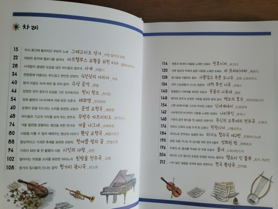 차례를 살펴보니 30명의 음악가에 대한 음악과 그 음악이 탄생하게 된 배경, 작곡가들의 이야기가 실려 있었어요.