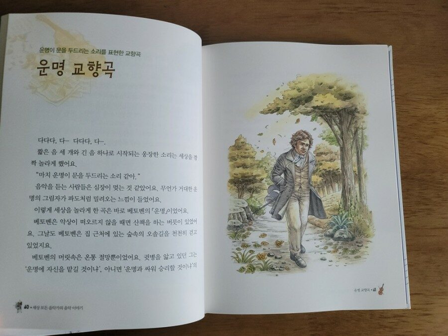 베토벤을 모르는 사람이 없을 정도로 유명한 음악가라고 설명해주면서 베토벤의 스토리를 읽었습니다.