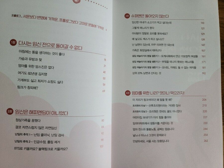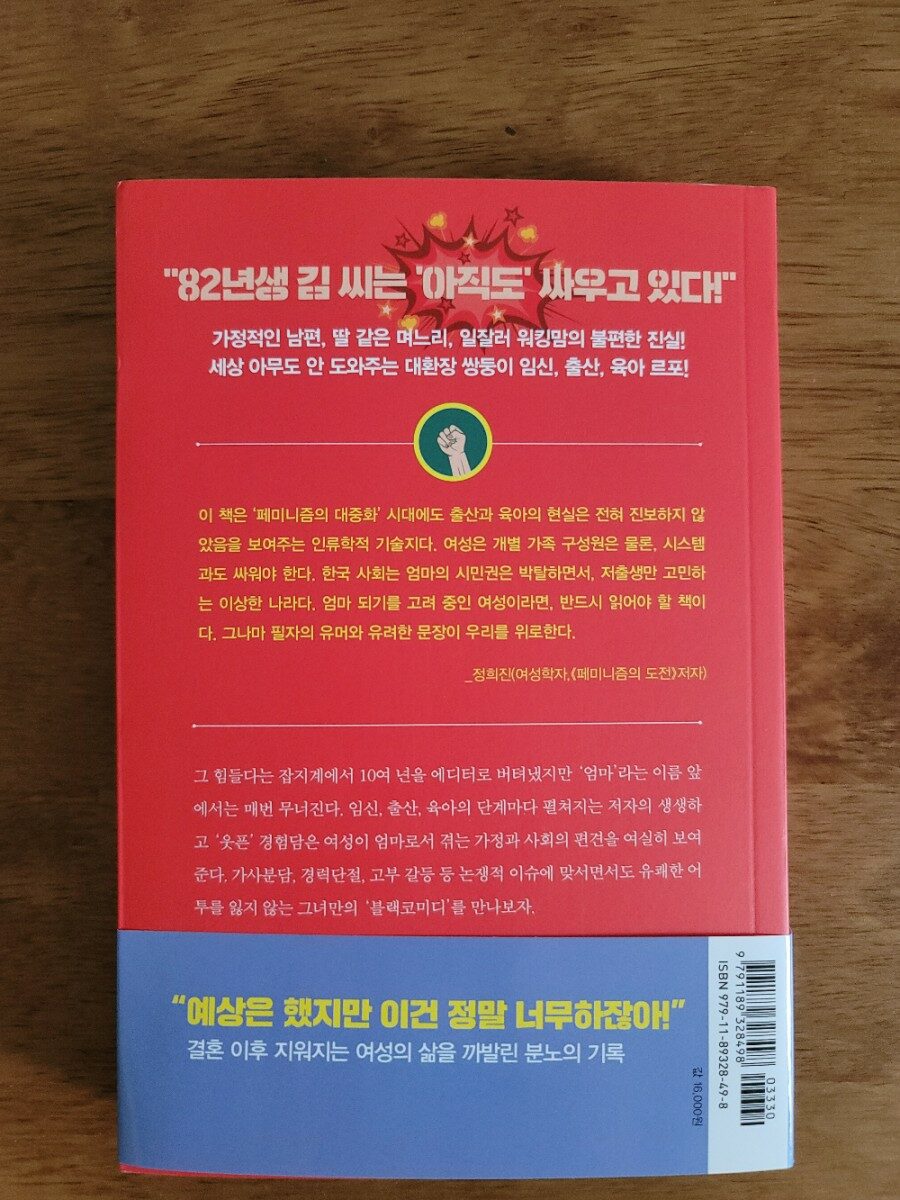 재미있고 속 시원한 내용의 책이라 시간가는 줄 모르고 한 권 쭉 읽어나갔고, 중간중간 나와 비슷한 상황이 나오면 나만 그런게 아니구나 하며 더더욱 공감되며 크게 재미를 느꼈다. 누구를 만나 수다를 떨며 스트레스 풀지 않아도 엄마를 위한 나라는 없다 한 권이면 충분하다!
