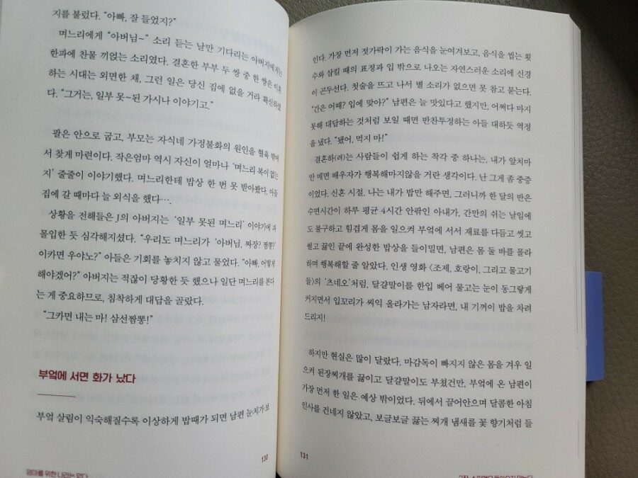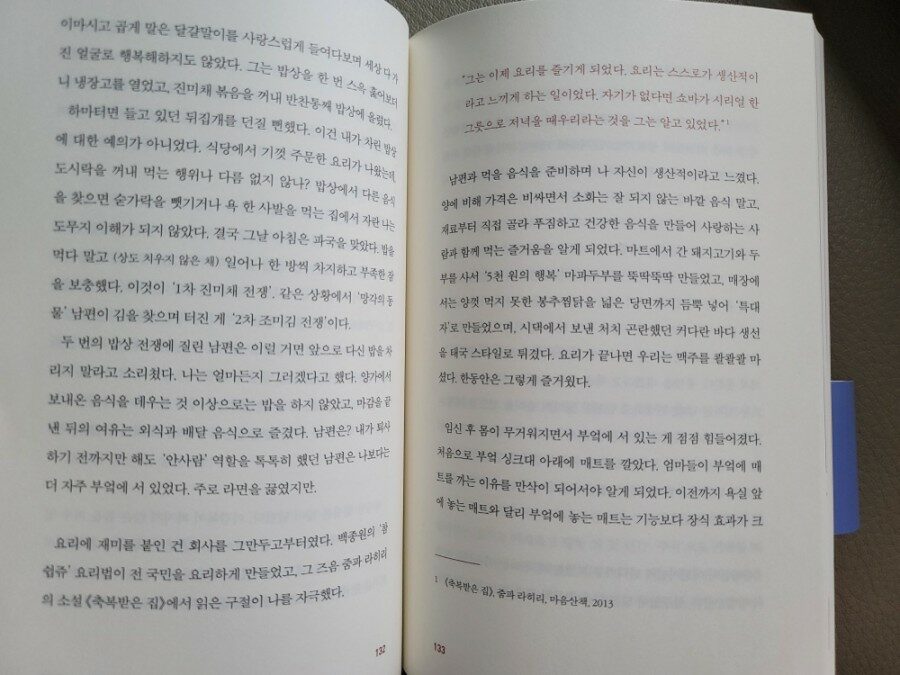 간만의 쉬는 날임에도 불구하고 힘겹게 몸을 일으켜 부엌에 서서 재료를 다듬고 씻고 썰고 끓인 끝에 완성한 밥상을 들이밀면, 남편은 몸 둘 바를 몰라하며 행복해할 줄 알았다. 하지만 현실은 많이 달랐다. 그는 밥상을 한 번 스윽 훑어보더니 냉장고를 열었고, 진미채 볶음을 꺼내 반찬통째 밥상에 올렸다. 하마터면 들고 있던 뒤집개를 던질 뻔했다. 이건 내가 차린 밥상에 대한 예의가 아니었다. 식당에서 기껏 주문한 요리가 나왔는데, 도시락을 꺼내 먹는 행위나 다름 없지 않나? p.131~132