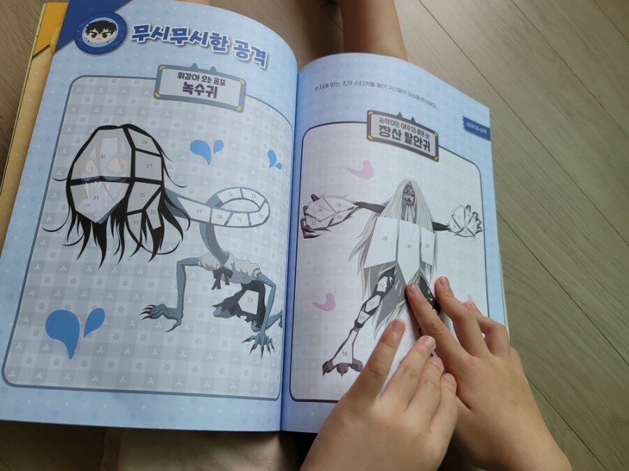 숫자에 맞는 조각 스티커를 붙여 귀신들의 모습을 완성해요.