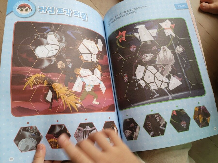 귀신 조각 퍼즐에서는 숫자에 맞는 조각 스티커를 붙여 그림을 완성한 뒤, 그림 속 퍼즐이 아닌 것을 찾아봅니다.