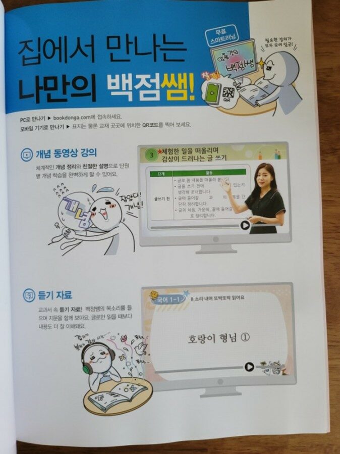 백점 국어는 집에서 만나는 나만의 백점쌤을 통해 개념 동영상 강의를 체계적인 개념 정리와 친절한 설명으로 단원별 개념 학습을 완벽하게 할 수 있어요. 교과서 속 듣기 자료를 통해 백점쌤의 목소리를 들으며 지문을 함께 살펴보아요.