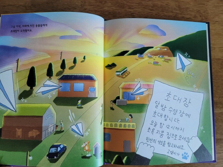 상자 안에 있던 고양이는 빨래 하려고 받아둔 대야에 찰랑찰랑 시원해보이는 물을 발견하고 더위에 지친 동물들에게 초대장을 보내죠.