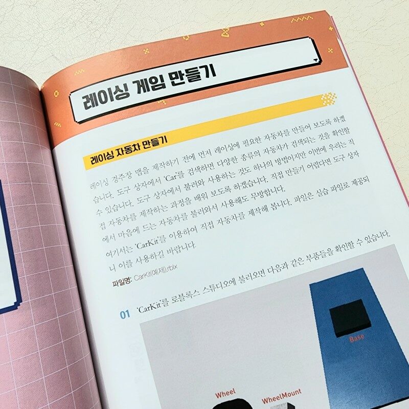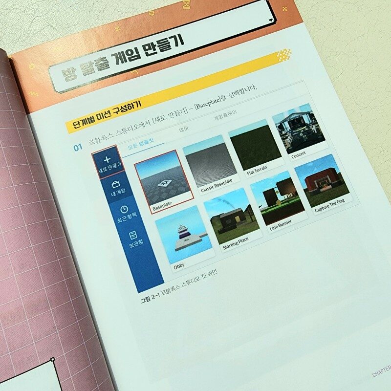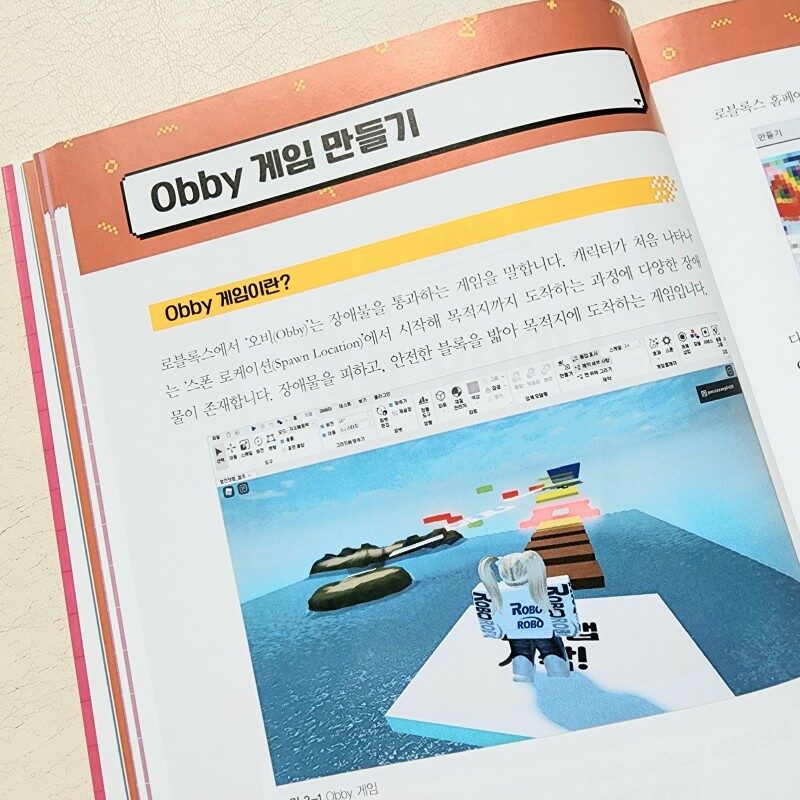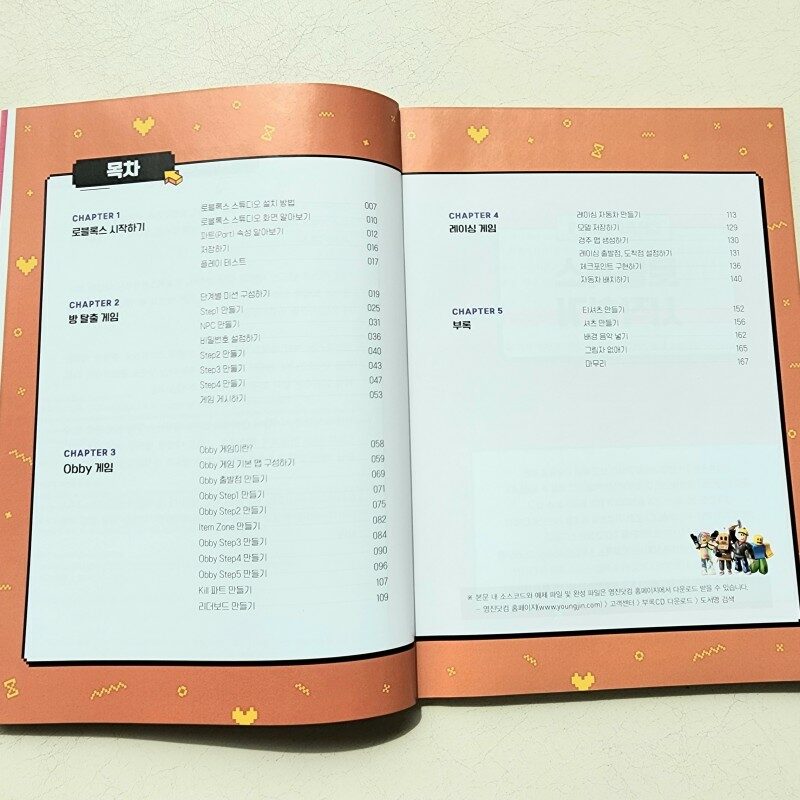 그리고 방탈출게임, Obby 게임, 레이싱게임 총 4종류의 게임을 직접 만들어 볼 수 있게 자세하게 설명되어 있어요. 그리고 마지막으로 간단한 팁들을 수록한 부록이 있구요.