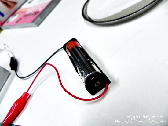 클립을 길게 펼치고, (-)극 집게 전선에 길게 펼친 클립을 연결을 합니다.