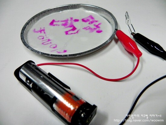 클립을 건전지에 연결해서 거름종이에 대면 전기가 통해서 글씨가 써지는 흥미로운 과학실험이에요.
