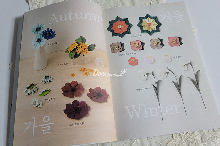 각 꽃의 이름을 소개하며 접는 방법의 난이도를 알려주고 작업별로 접는 방법을 사진과 글로 소개하며 완성된 사진 물론 부분별로 접은 사진까지도 함께 보여주는 <사계절 꽃 종이접기>