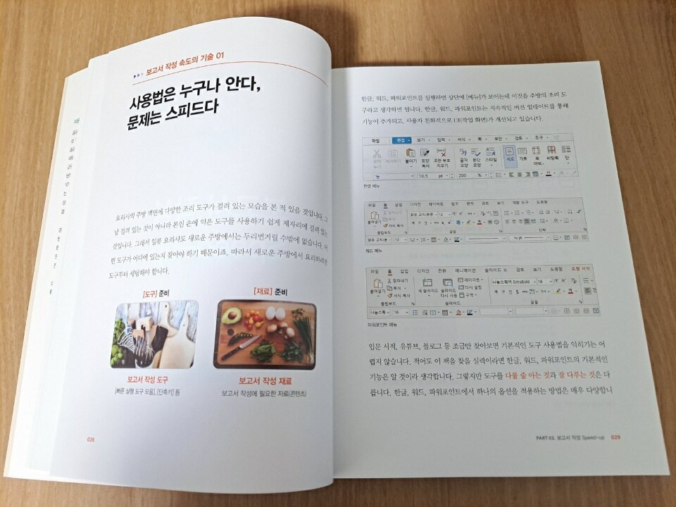 "실전 보고서 작성 기술 with 파워포인트, 워드, 한글"이라는 제목을 보고 책 한 권으로 한글, 워드 파워포인트에 도움이 되는 것들을 모두 배울 수 있다는 막연한 기대를 안고 이 책에 관심을 갖게 되었다. 하지만 이 책의 머리글을 읽고서 " 실전 보고서 작성 기술 with 파워포인트, 워드, 한글"은 소프트웨어 사용법이 아닌 활용법, 즉 활용 기술을 다룬 책이라는 것을 알게 되었다. 이 책을 읽으며 가장 좋았던 점은 바로 각 파트가 끝나면 읽었던 내용들을 한눈에 정리할 수 있는 "학습 정리" 부분이었다. 가독성 높은 보고서를 작성하는 노하우를 알려주는 책답게 "실전 보고서 작성 기술 with 파워포인트, 워드, 한글"이라는 책도 가독성이 높아 술술 읽혔다. 다양한 예시와 책의 중간중간에 나오는 컨설턴트의 조언도 이해를 도왔고, 평소 가독성 높은 보고서를 위해 고민했던 부분들도 해결되어서 좋았다. 요리를 잘 하는 요리사라도 낯선 주방에 가면 두리번거릴 수밖에 없다. 빠른 요리를 위해서 도마와 칼 등의 도구들을 세팅하는 것처럼 빠른 보고서 작성을 위해서는 사용자의 편의에 맞게 도구들을 세팅하는 것이 필요하다는 것을 느꼈다. 그래서 이 책은 파워포인트, 워드, 한글에 대한 아주 기초적인 사용법을 배우려는 분들보다는
