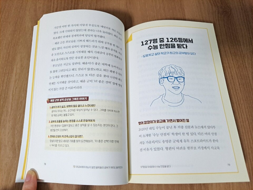 주인공들은 모두 자신만의 공부 발화점을 만났다. 누군가가 시켜서 하는 게 아니라 자신의 깨달음에 의해 계획도 짜고 자신만의 공부 방법을 터득했기 때문에 하위권이었던 성적이 급상승할 수 있었다는 생각이 들었다.