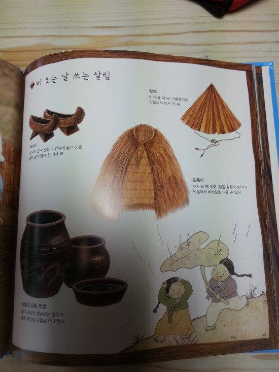 예전에는 이렇게 나막신, 갈모, 도롱이가 있었다는것을 아이에게 설명을 해주었어요.
