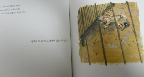 이 그림책은 자연속에 살고 있는 동물들의 모습과 그 동물들이 동물원에 갇혀서 살고 있는 모습이 교차해서 그려져 있다.