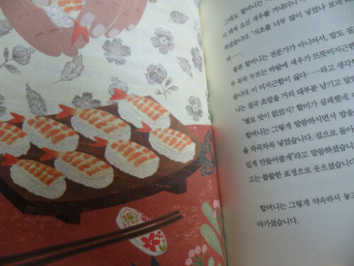다른 이야기로는, 어릴 적에 할머니가 생일 마다 초밥을 사주셨는데, 그때마다 새우초밥을 즐겨 먹었다. 고등학생이 된 후에는 친구들과 생이를 보내고 싶었는데, 어느 해 생일에 할머니가 초밥을 만들 재료를 준비해서 찾아 온다. 할머니가 만든 초밥은 밥도 질퍽하고, 식초를 너무 많이 넣어서 맛이 없었다. 그것을 눈치챈 할머니는, " 별로 맛이 없었지? 할미가 실패했네, 미안해" (....) " 내년에는 더 맛있게 만들어 줄께" 그러나 그 약속은 지켜질 수가 없었다. 이듬해 할머니는 지진으로 돌아가셨다. 조금은 시큼하고 할머니의 손길이 닿아서 뜨뜻미지근했던 새우 초밥의 맛을 그녀는 평생 잊을 수 없을 것이다.