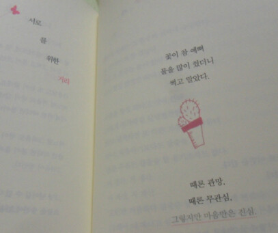 책 속의 문장들은 절제되고 간졀하지만 그 속에 담긴 메시지는 마음 속에 와닿으면서 깊은 공감을 불러 일으킨다.