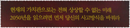 그당시에는 예측할 수 없었던 상황들이 지금 일어나고 있는데, 과연 2050년의 예측은 얼마나 적중할 지 의문점도 있지만, 이 책의 내용은