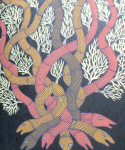 곤드족은 인도 중부 마디아프라데시 주에 사는 사람들인데, 이들은 시각이 뛰어나서 그들이 살고 있는 집의 흙바닥이나 벽에 그림을 그린다. 마치 원시시대의 삶의 모습이 그들의 주거지의 벽에 그려지듯이.