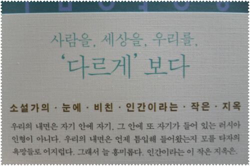 " 우리의 내면은 자기 안에 자기, 그 안에 또 자기가 들어 있는 러시아 인형이 아니다. 우리의 내면은 언제 틈입해 들어왔는지 모를 타자의 욕망들로 어지럽다. 그래서 늘 흥미롭다. 인간이라는 이 작은 지옥은" (p. 75)