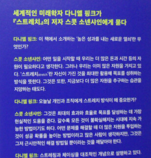 마지막으로 세걔적인 미래학자 다니엘 핑크가 <스트레치>의 저자 스콧 소넨샤인에게 묻는 질문을 살펴보면 이 책의 요점이 그대로 정리되어 있다.  (책 뒷날개 속)