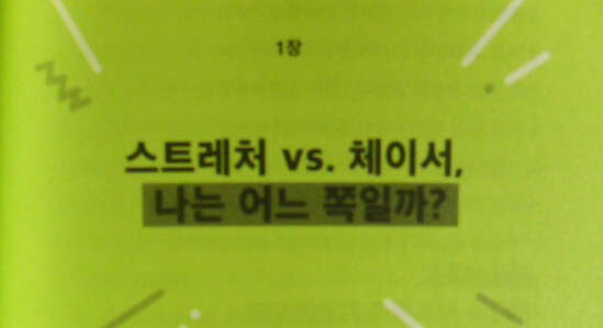 처음 이 책을 읽기 전에는 책소개글인  " 당신은 스트레처인가? 체이서인가?  숨은 능력을 쭉쭉 늘리는 스트레치 방법" 이라는 글이 쉽게 이해할 수 없는 어려운 책이 아닐까 하는 선입견을 갖기도 했다.