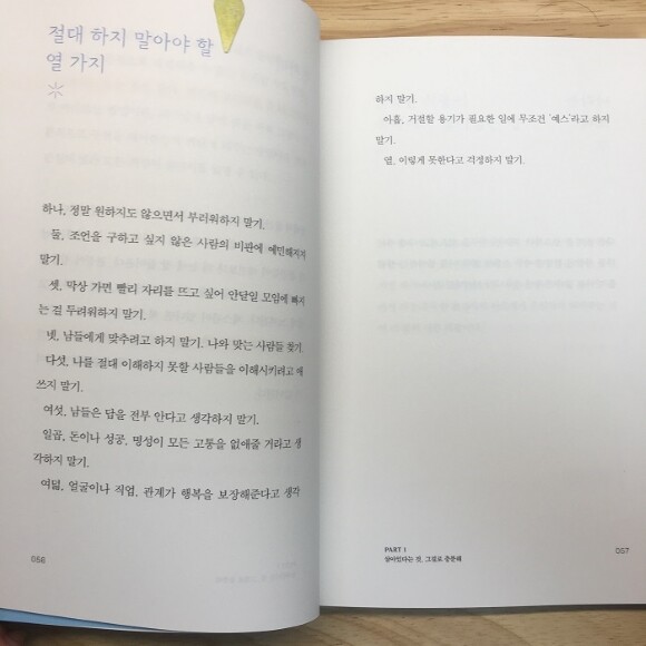 절대 하지 말아야 할 10가지 중 하나라도 해당되지 않는 사람은 없을 것이다. 사회생활을 하고 인연을 맺을 때마다 상대가 마음이 상할까 봐 속마음은 하기 싫지만 겉으로 따라 하다 보면 결국 마음에 상처를 입고 부정적 생각에 빠지게 된다.