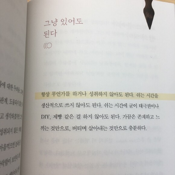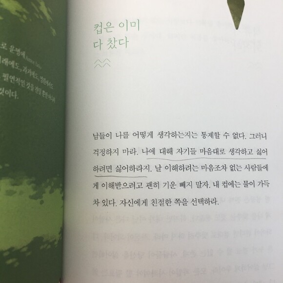 총 4개의 파트로 구성되어 있는데 전해주는 글이 길지 않고 적당한 분량으로 페이지가 구성되어 있어 읽는 것에 부담도 없고 목차를 보고 마음에 드는 소제목을 선택하여 읽어도 좋다. 티타임이나 잠시 휴식을 취할 때 보면 불편했던 마음이 사라지고 차분한 마음이 든다.