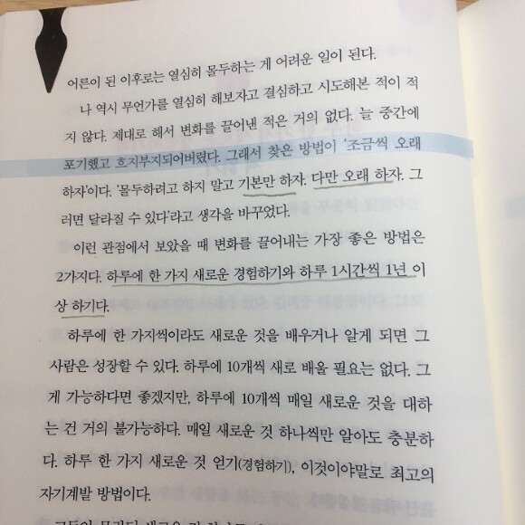 저자는 해결책으로 하루에 한 가지 새로운 경험하기와 하루 1시간씩 1년 이상하기를 제시해 주었다.