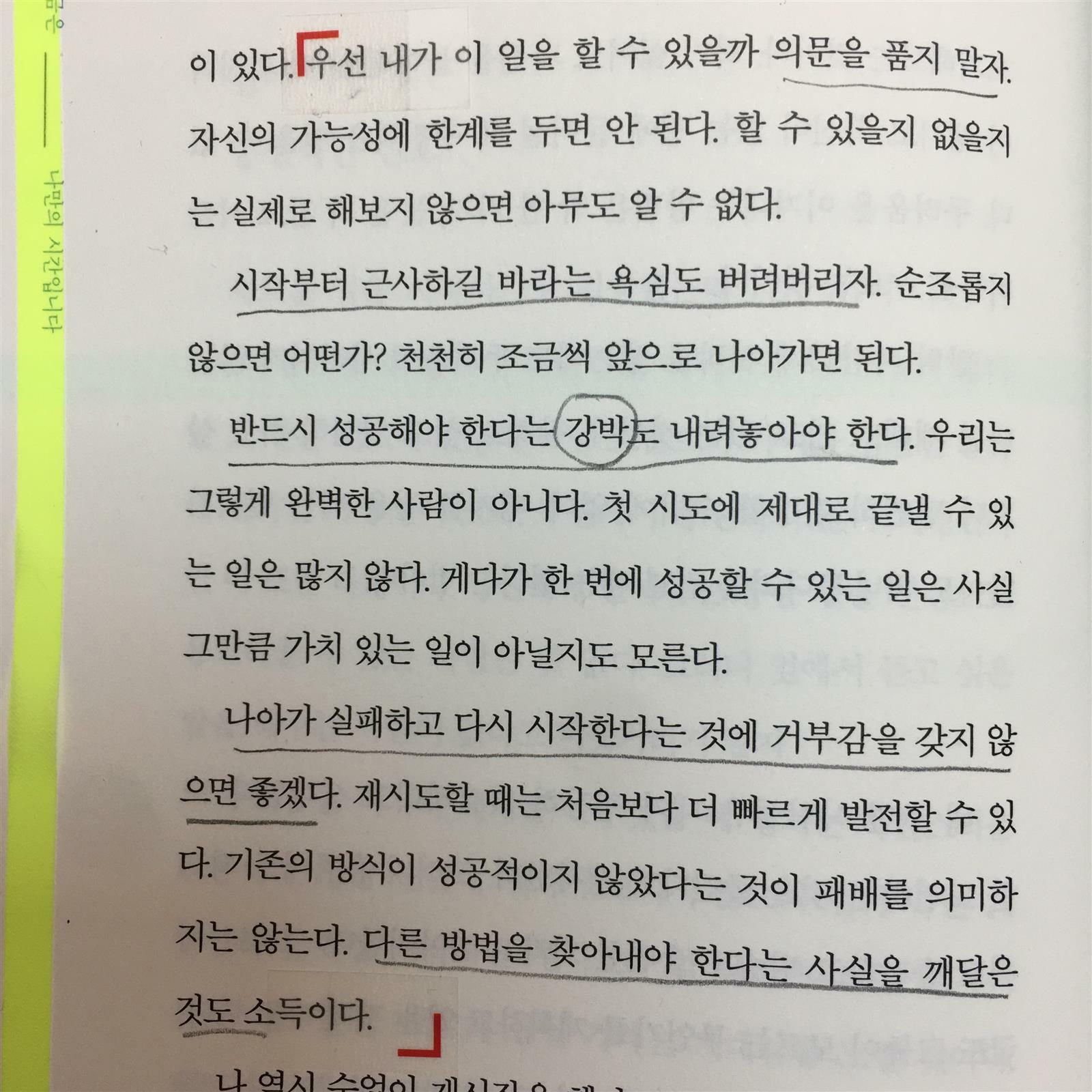 하고 싶은 일이 있다면 저지르고 나서 수습하라는 애기를 종종 들었다. 저지르고 싶지만 뒷일이 두렵고 실패하면 어쩌나하는 걱정에 주저앉고 만다. 그런면에서 의문을 품지말고 욕심과 강박을 버리고 실패에 거부감을 갖지말라는 이야기는 용기를 주는 말이다. 누구나 알고 있고 실행하기 어렵지만 험난한 과정을 한번 넘어본 사람은 자신감이 붙고 계속 새로운 것에 도전하여 성공을 한다. 할 수 없다는 말보다는 할 수 있다는 말을 내뱉을 수 있는 사람이 되어보자.
