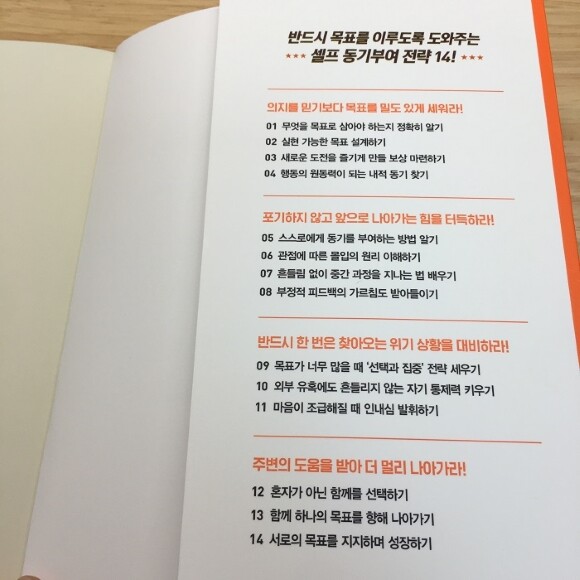 마지막 4부에서는 목표 달성의 숨은 조력자, 사회적 지지에 대한 이야기를 다룹니다. 의욕적으로 목표를 세우고 실행해 나갈 때 혼자 하는 것도 좋지만 옆에서 러닝메이트처럼 함께 뛸 사람이 있다면 동기부여받기도 좋고 주저앉고 싶다가도 앞서가는 사람의 등을 보고 앞으로 나아갈 수 있는 용기를 얻기도 한다. 혼자 하는 것이 맞는 사람들도 있겠지만 어느 정도에 서있는지 확인하고 싶을 때 같은 목표를 가지고 있는 사람들과 함께 하며 가늠해 보는 것도 좋을 것 같다.