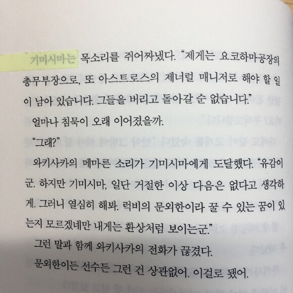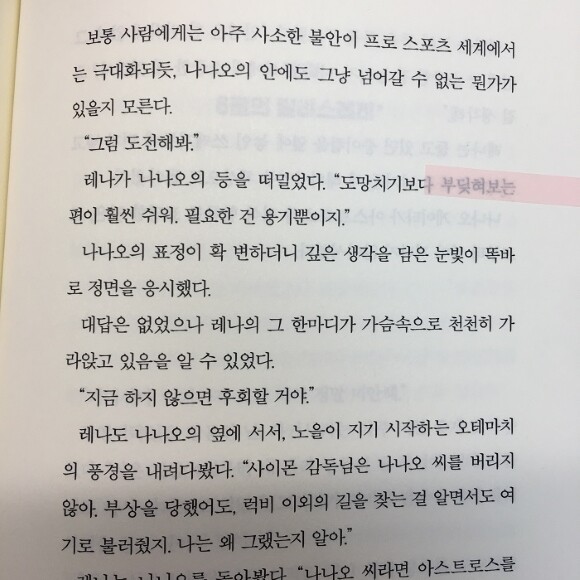 책에서 마음에 와닿은 장면은 레나가 럭비팀에 임시 합류하고 있는 나나오에 정식으로 럭비팀에 합류하여 활약하길 바라며 조언해 주는 장면이었다.