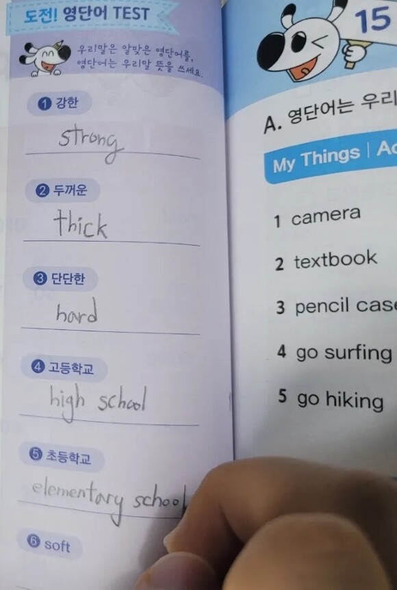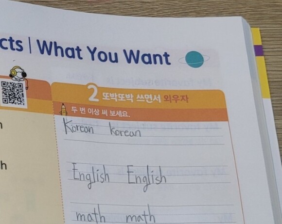 영어노트에 다섯번씩 더 적어보고 있어요.