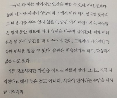 누구나 다 아는 말이지만 인간은 변할 수 있다. 아니, 변한다. 삶의 어느 한 시점이 엉망이라고 해서 미래 역시 엉망일 것이라고 단정 지을 수는 없지 않은가. 습관 역시 마찬가지다. 사람들은 일생 동안 필요에 따라 습관을 바꾸며 살아간다. 이제 여러분은 몇가지 습관을 더 바꾸어야 한다. 그래야만 감정적인 평화와 행복을 얻을 수 있다.