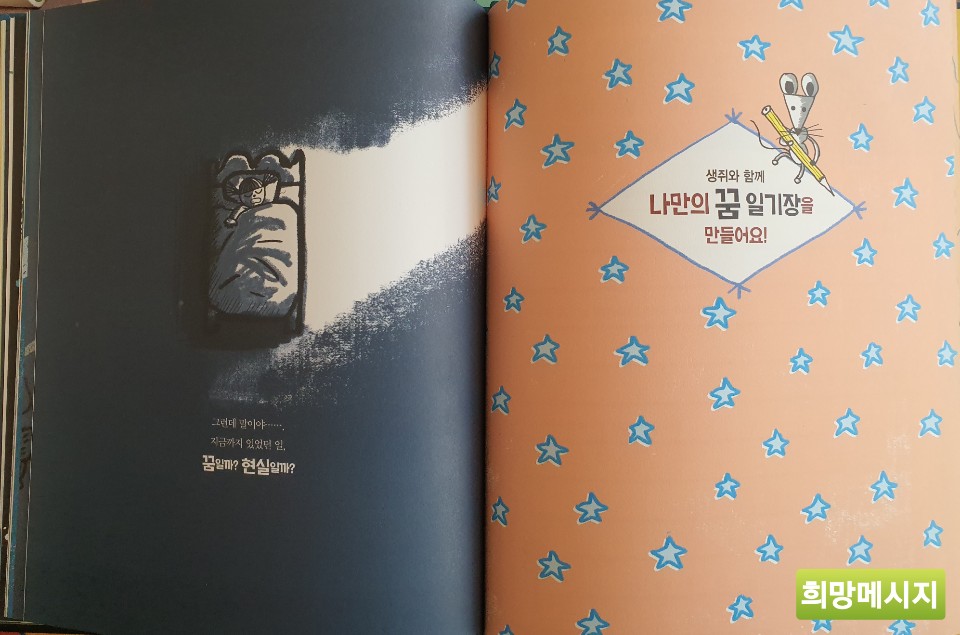 마지막 장, 웃음을 참는 엄마, 아빠의 표정과 마냥 행복해 하는 아이의 모습에서 행복함이 보인다. 주인공은 오늘 큰 침대에서 엄마와 잘 생각에 너무 행복하다.