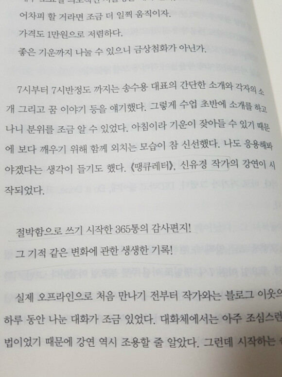 <<땡큐레터>> 신유경 작가의 강연으로 새로운 계획을 세우고 절묘한 타이밍으로 마법같은 순간의 연속의 경험이 감사일기와 감사편지로 알찬 주말을 만들어 간듯 하다.