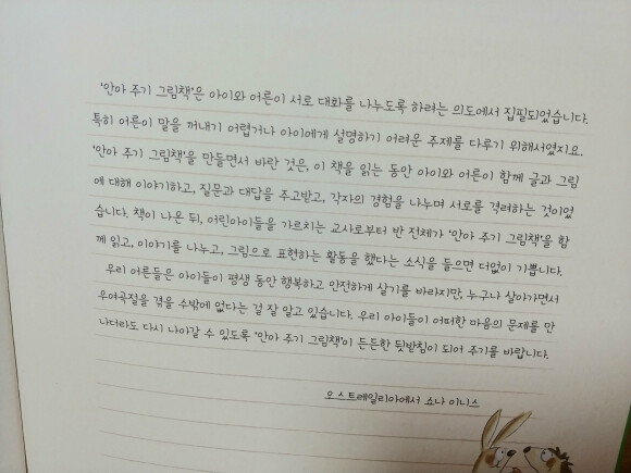 책의 저자 #쇼나이니스 는 아동 심리뿐 아니라 청소년, 성인 대상 심리 치료를 1980년 부터 해왔다고 해요. 다양한 치료 과정에서 접한 사례로 아이와 어른이 서로 대화를 나누도록 하려는 의도에서 안아주기 그림책을 집필했다고 하네요. 어른이 말을 꺼내기 어렵거나 아이에게 설명하기 어려운 주제를 다룬 책으로 이 책을 읽는 동안 아이와 어린이 함께 글과 그림에 대해 이야기하고, 질문과 대답을 주고 받고, 각자의 경험을 나누며 서로를 격려할 수 있으리라 봐요. 특히, 평소 육아에 대한 팁이나 전문가 이야기를 듣고 싶어 유튜브에서 그 주제로 많이 찾아보곤 하는데 아주대학교 정신건강의학과 #조선미교수 님의 <EBS 엄마 마음 읽기>, <엄마가 달라졌어요> 영상을 보며 도움을 받곤 했는데 그 교수님이 감수하셨다니 꼼꼼히 읽고, 믿고 볼 수 있을 것 같아요.