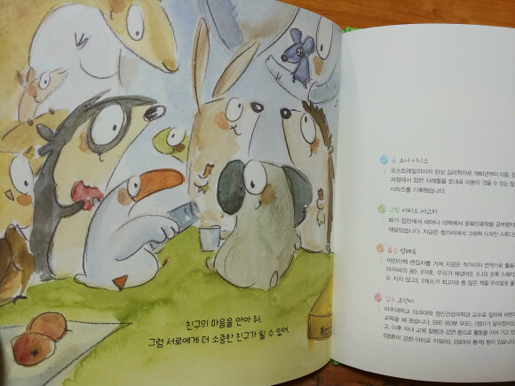 주말에 외출하면서 책한권을 챙겨 나갔는데 지하철에 앉아서 읽어주었어요. "친구와 사이좋게 지내려면, 서로를 마주 보며 마음을 잘 맞춰야해" 올해 초등학교 입학한 누나도 유심히 듣고 있어요. 새로운 친구들을 많이 사귀면서 좋은 친구 관계를 유지 하려면 어떻게 해야할찌 마음에 와 닫는거 같네요. "친구의 마음을 안아줘. 그럼 서로에게 더 소중한 친구가 될 수 있어"