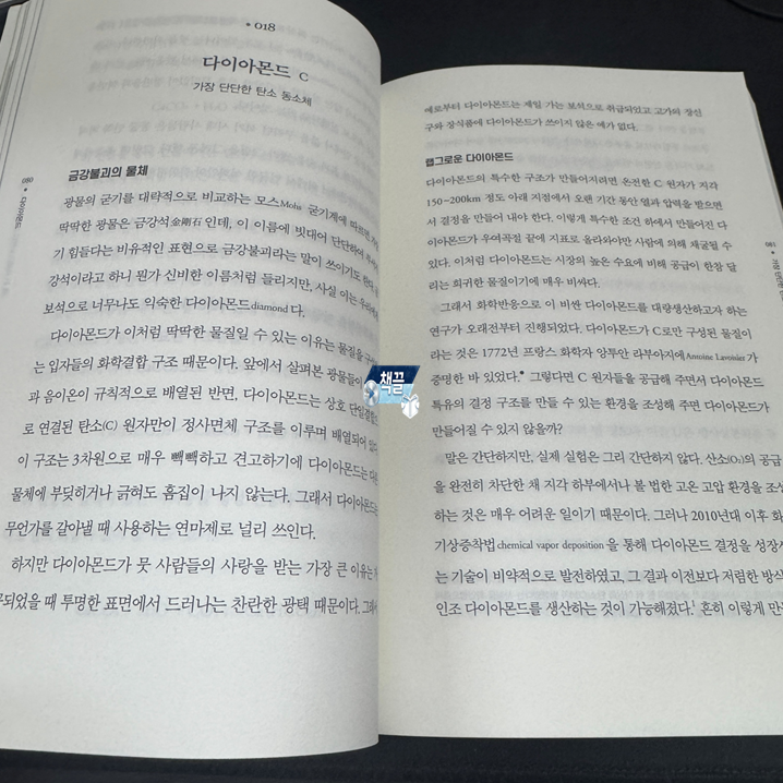 예를 들어, 이 책에서 다루는 다이아몬드(탄소, Carbon)는 단순한 보석이 아니다. 다이아몬드는 연필심과 같은 탄소 원자가 전혀 다른 결합 구조를 가질 때 탄생한 물질로, 화학 결합 방식 하나가 물질의 성질을 얼마나 극적으로 바꾸는지를 보여주는 대표적인 사례다. 이는 물질의 ‘본질’을 이해하는 화학적 사고가 왜 중요한지를 직관적으로 드러낸다.