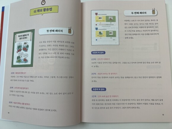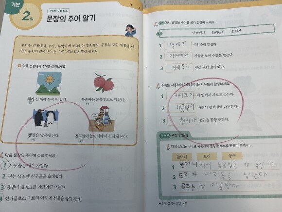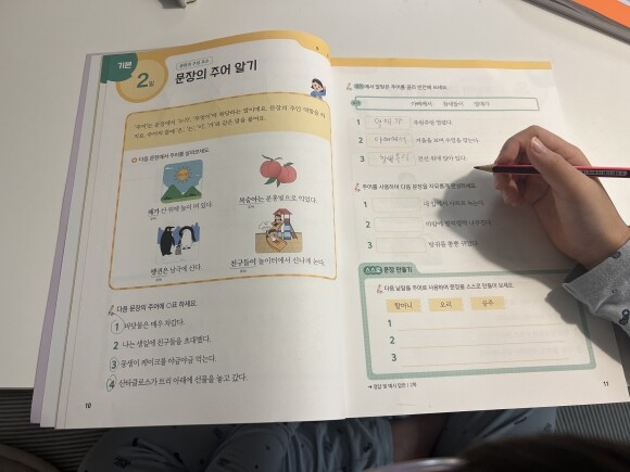 쓰기가 처음부터 많이 등장하지 않고 빈칸채우기 다음 문장을 만들어보면서 단계적 글쓰기 연습이 가능합니다.