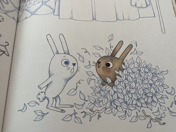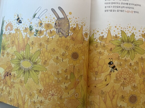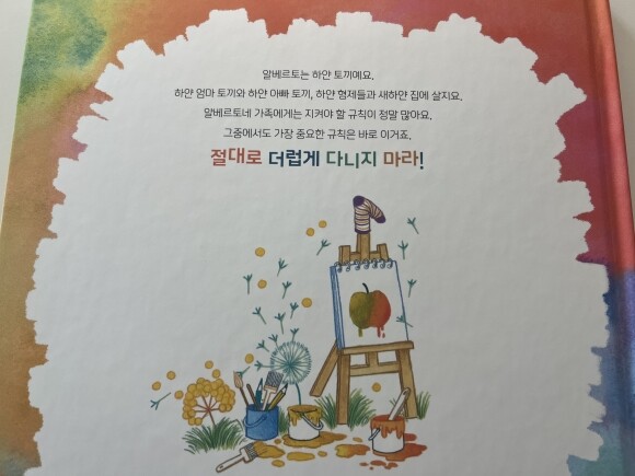 하얀 바탕에 두 마리 토끼가 다양한 경험을 통해 다양하고 아름다운 색을 갖게 되죠.