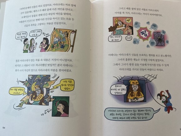 또 그리스로마신화 이야기를 통해 이야기마다 교훈을 얻을 수도 있어 유익하기도 합니다. 특히 거미가 된 아라크네를 읽으면서 사람은 오만하지 말고 겸손해야 한다는 교훈을 느낄 수 있었고, 강자인 아테나가 약자를 억압하고 함부로 대하는 태도는 하면 안 되겠단 생각도 아이와 함께 생각해 보았답니다.