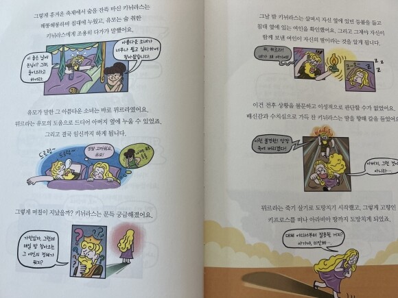 전체적인 내용은 술술 읽어가며 이해가 되고 핵심적인 부분은 생생하고 재미있게 그리스 로마 신화를 즐길 수 있답니다. 그래서 어린이부터 초등학생 또는 성인까지 나이를 가리지 않고 읽을 수 있는 이야기인 것 같아요.