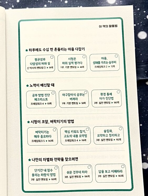 수많은 학생을 가르치며 어떤 방법이 실제로 효과적인지를 오랜 시간에 걸쳐 깨달은 저자는, 보통의 학생들에게는 최상위권과는 다른 공부 방식이 필요하다고 강조한다. 또한 공부에 의욕이 없는 경우에는 공부법보다 오히려 인생 상담이 먼저라고 말한다.