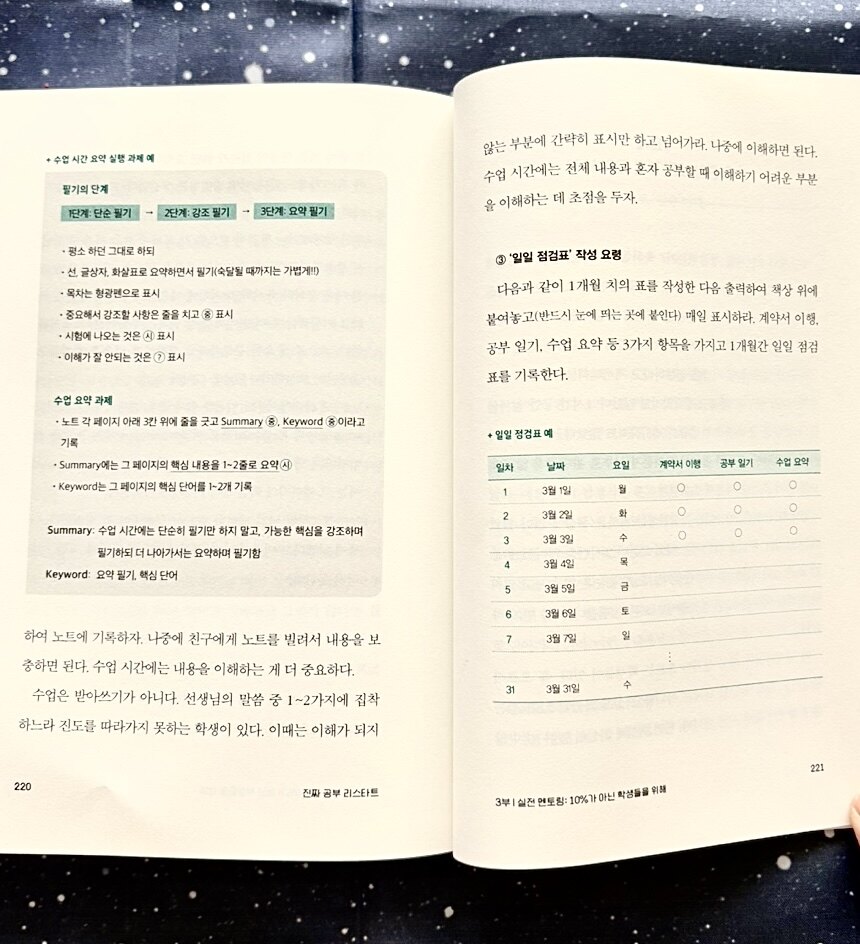 1단계에서는 마음을 다잡고, 2단계에서는 공부 일기를 쓰며 수업에 집중하는 습관을 들인다. 3단계에서는 요약의 중요성과 방법을 차근차근 배워나가며, 이 과정을 성공적으로 마치면 4단계의 가속화는 자연스럽게 따라온다. 저자는 4개월간 이 과정을 성공적으로 실행한 후에는 반복을 통해 자신에게 맞는 공부 방식으로 조정해 나가는 것이 좋다고 덧붙인다.